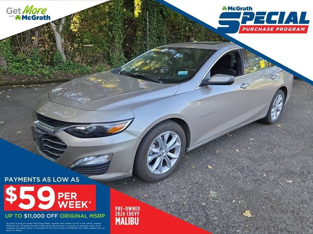 28/36 City/Highway MPG Clean CARFAX.2024 Chevrolet Malibu LT 1LT 1.5L DOHC FWDWelcome to McGrath Chevy, your destination for award-winning automotive experiences. We were voted CBJ's 2024 #1 Coolest Place to Work and winner of 2024 Best of the Best Auto Dealer, Auto Service, and Fleet Dealer. We’re proud to deliver unmatched quality and service. With over 11,000 5-star Google reviews, our customers’ trust and satisfaction drive everything we do. Whether you’re buying, servicing, or building your fleet, experience why McGrath Chevy is the top choice for all your automotive needs! We’ve got everything from tough trucks to fuel-sipping commuters and adventure-ready SUVs. Our vehicles go through a rigorous inspection process, and we offer multiple layers of certification based on the vehicle's age, mileage and inspection results. Whether you’re shopping for a brand-new ride or a budget-friendly pre-owned gem, we’re here to make the process easy, fun, and stress-free.Prices may change at any time and are subject to availability and prior sale. Taxes, title, license fees, and a $180 documentation fee are not included. Payments shown are estimates; actual terms vary by buyer and credit approval. Dealer is not responsible for errors in pricing or vehicle details, information is believed accurate but not guaranteed. Photos are for illustration only confirm details with the dealer. Fuel economy ratings and driving range figures are based on EPA estimates for new vehicles, and actual mileage and range may vary. By submitting your phone number, you consent to occasional SMS or calls about our products and promotions; standard messaging rates apply. See dealer for details. Fuel economy figures are official EPA estimates and clearly labeled as such.